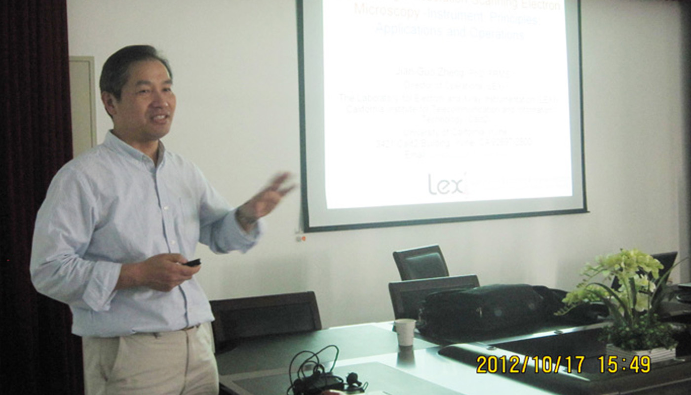 10月17日下午,美国加州大学尔湾分校博导郑建国教授应邀请来威尼斯官网9499www威尼斯作题为“极高(亚纳米)分辩率扫描电镜的结构、原理及应用”的学术报告。
