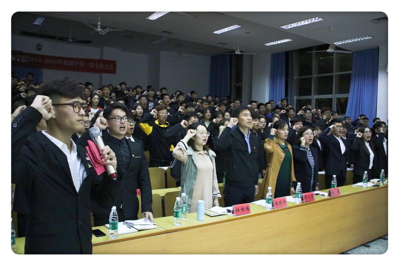 大会在嘹亮的团歌声中拉开帷幕。学院上一届学生会主席蔡昊凌同学回顾和总结了过去一年学院团学工作的开展情况和取得的成绩,学院团委副书记张振兴介绍了新一届团学组织架构的改革和调整情况,学院现任团委副书记何明辉同学和学生会主席朱伟同学分别代表学院团委和学生会做工作规划,外联部部长孙亚成同学代表全体团学干部做表态发言,学生会副主席何焕文同学带领全体团学干部宣誓。