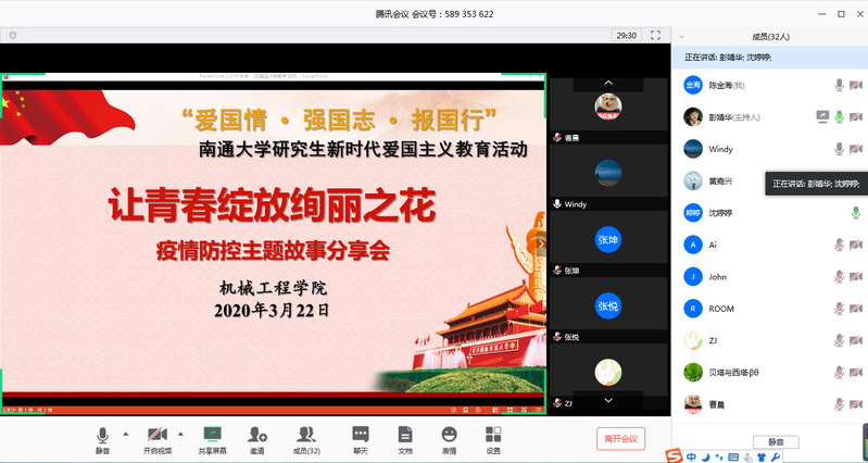 322日下午,9499www威尼斯研会与18机械研究生团支部联合开展团日活动,在线举行研究生爱国主义主题教育活动——“让青春绽放绚丽之花疫情防控主题故事分享会。全体18级和1719级研究生代表参加活动。